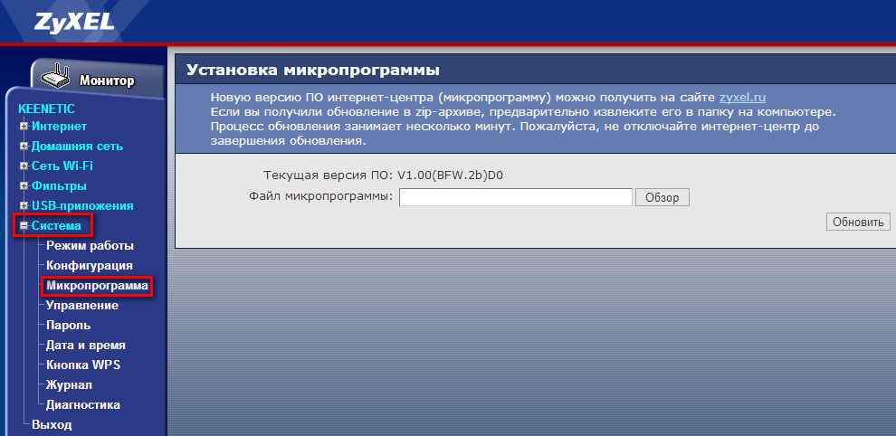 роутер Zyxel Keenetic. Для того, чтобы маршрутизатор всегда стабильно работал и поддерживал все существующие стандарты связи и подключаемые устройства, необходимо регулярно обновлять микропрограмму — то есть его «операционную систему». Это можно осуществить двумя способами. Автоматически с официального сайта, либо через веб-интерфейс админки, выбрав файл микропрограммы вручную. Этот порядок актуален для любой модели серии Zyxel Keenetic