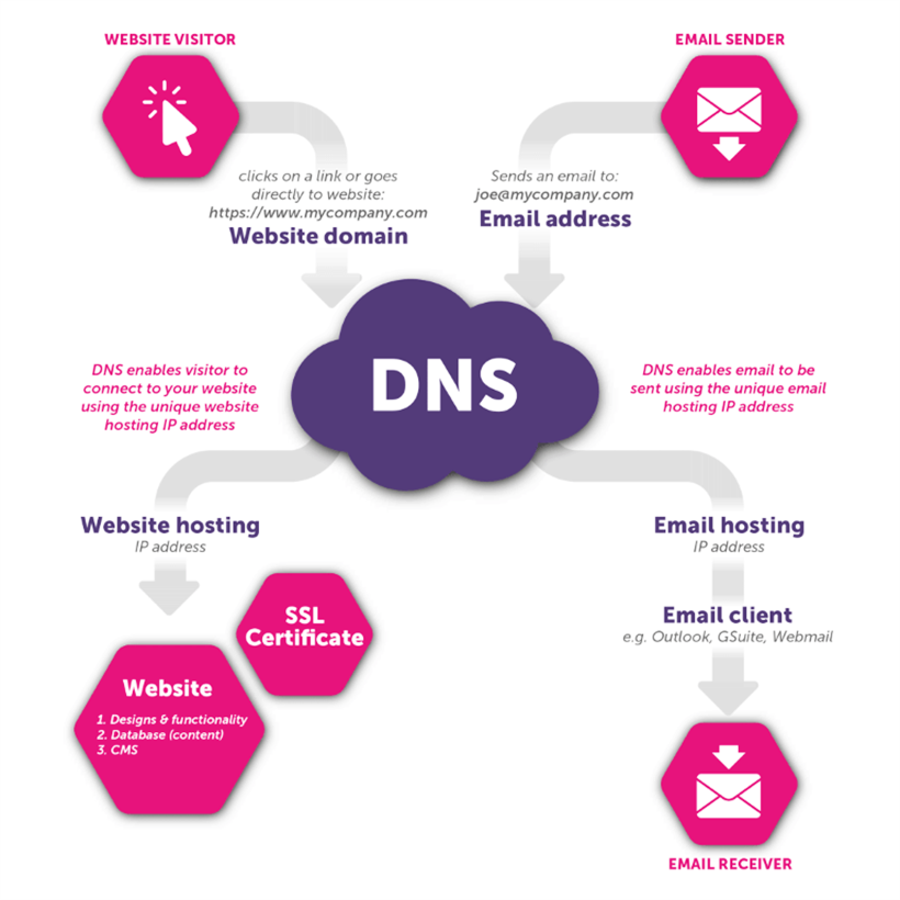 Система доменных имен преобразует удобочитаемое имя веб-сайта в IP-адрес. Когда вы вводите имя веб-сайта в адресную строку браузера, ваш браузер отправляет это имя на DNS-сервер. DNS-сервер помогает направить запрос на соответствующий IP-адрес этого веб-сайта.