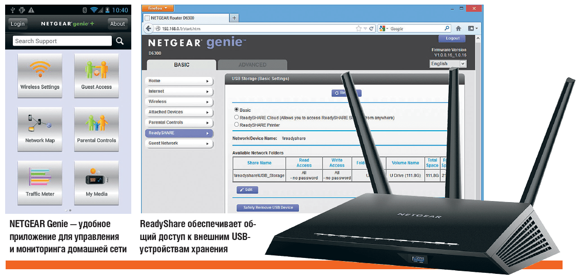 Протестированный нами двухдиапазонный роутер Netgear R7000 Nighthawk с микропрограммным обеспечением Netgear Genie сразу предоставляет беспарольный доступ ко всем внешним устройствам, подключенным через порт USB. Для этого нужно лишь ввести IP-адрес в Проводнике Windows, например 192.168.1.1. Дополнительные опции вы найдете в меню веб-интерфейса ReadyShar».