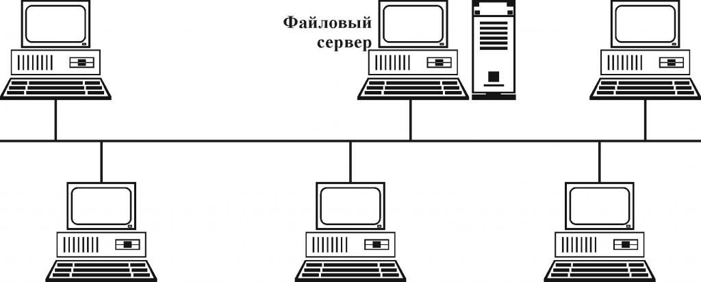 Данный вид соединения характеризуется наличием сервера, к которому подключаются все сетевые устройства. Доступ к информации и обмен ею происходит только при помощи центрального сервера.