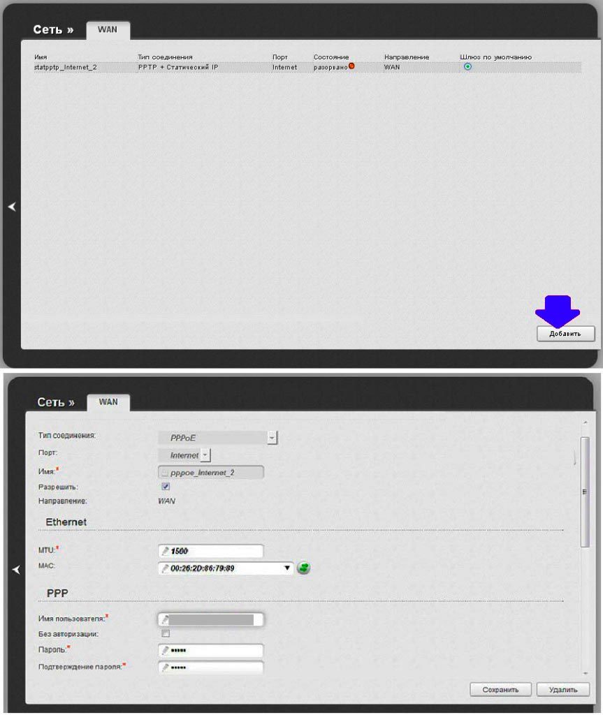 Нажимаем клавишу «Добавить», тем самым создаем новое подключение к сети. Здесь нужно ввести те данные, которые Вам предоставляет провайдер. Тип соединения, логин и пароль должны быть уточнены в контракте, не забудьте эти моменты уточнить у него. Это обязательно для подключения к инету. Жмем «Сохранить».