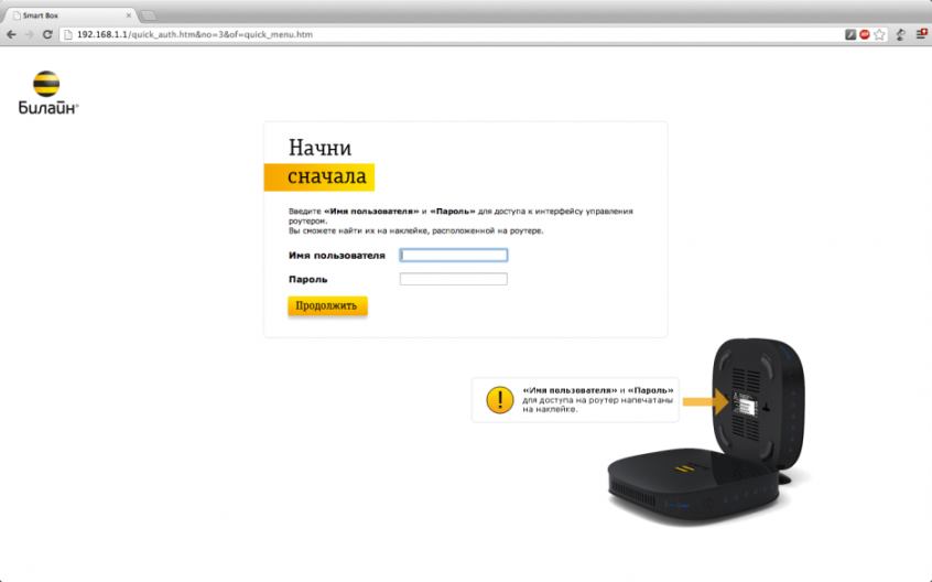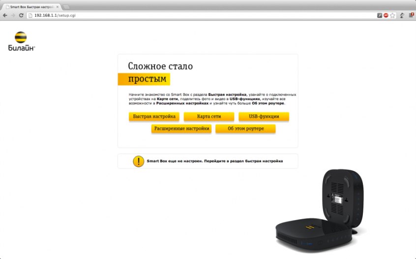 Вводим логин admin, пароль admin и попадаем в стартовое меню настройки Smart Box от Билайн.