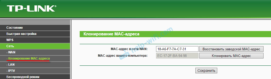Клонировать MAC можно на вкладке «Сеть» – «Клонирование МАС-адреса».