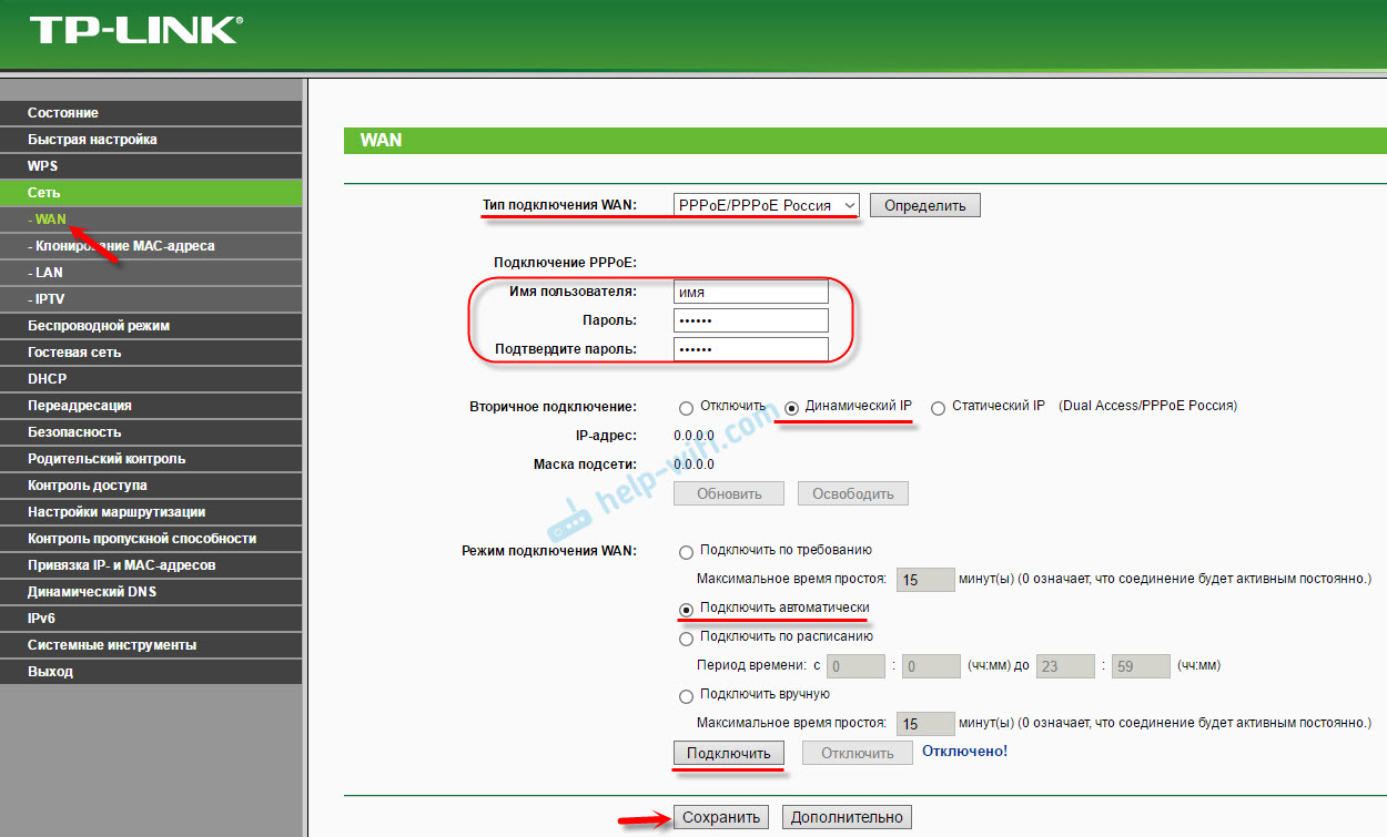 В разделе WAN выберите соответствующий тип подключения PPPoE, или PPTP. И ниже укажите необходимые параметры. Обычно это имя пользователя и пароль. Так же, скорее всего нужно выставить «Динамический IP», и обязательно проверить, чтобы было установлено «Подключить автоматически».
