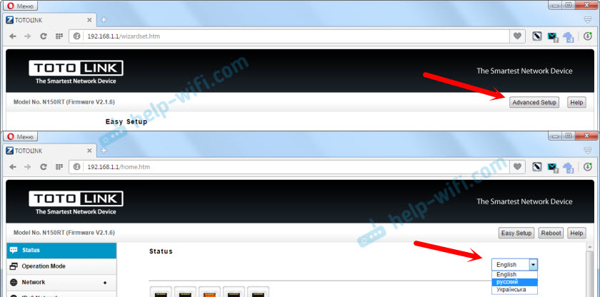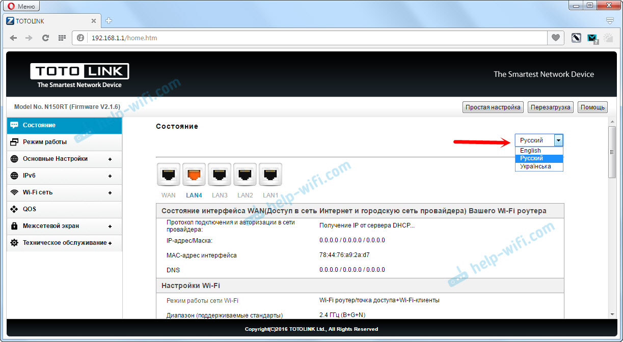 После авторизации откроется страница с быстрыми настройками маршрутизатора Totolink. Давайте еще покажу, как сменить язык на русский, или украинский. Так как у меня по умолчанию был английский.