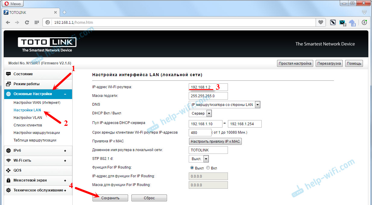 Чтобы была возможность зайти в настройки репитера, нужно перед сменой режима работы сменить IP-адрес роутера Totolink. Я проверил, все получилось. Можете сбросить настройки к заводским, и настроить все заново. Перед этим сменив IP-адрес. Сделать это можно на вкладке «Основные настройки» – «Настойки LAN». Меняем адрес например на 192.168.1.2.