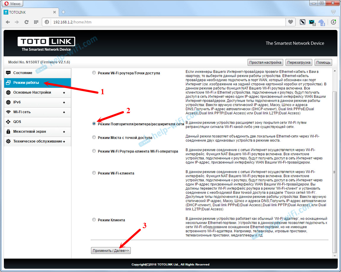 Переходим в раздел «Режим работы». Ставим переключатель возле пункта «Режим повторителя/репитера/расширителя сети». Нажимаем на кнопку «Применить / Далее».