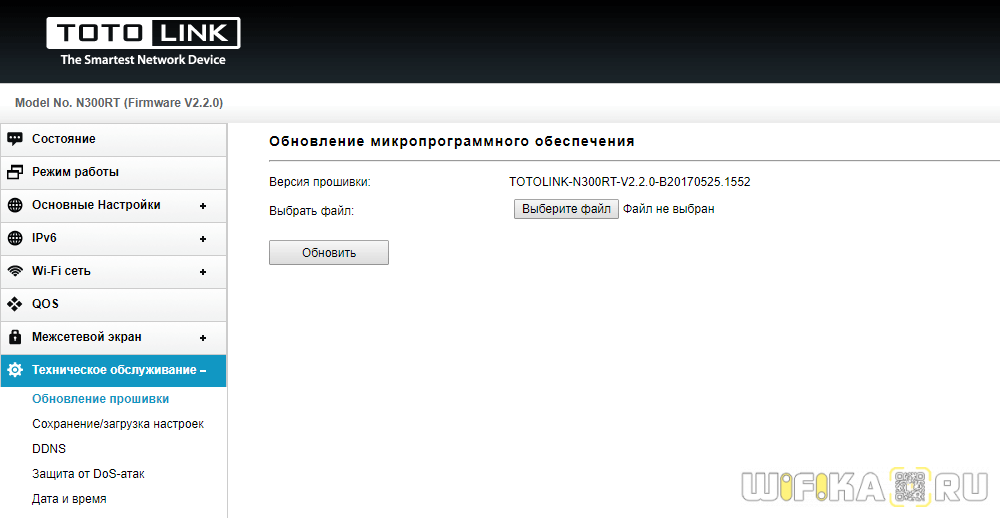 Что если попробовать обновиться без скачивания файла? А вот это невозможно. Прошивка роутера TotoLink происходит в одноименном разделе меню и здесь есть возможность только выбрать заблаговременно скачанный из интернета файл. Полазав по различным тематическим форумам в поиске свежих обновления, я сделал вывод, что реально у меня была установлена самая свежая прошивка. Почему ее нет на сайте модели, для меня остается загадкой.