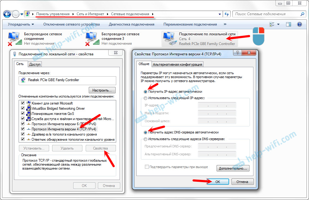 - Установить галочки на получение IP-адреса и DNS-сервера в автоматическом режиме.