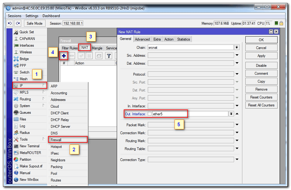 NAT это технология придуманная из-за нехватки ipv4, в дословном переводе означает «трансляция сетевых адресов». Простыми словами роутер будет подменять все запросы от локальной сети и отправлять их со своего ip. Дополнительный плюс — это закрывает внутреннюю сеть и защищает ее. Все ее настройки делаются в IP-> Firewall вкладка NAT. Добавляем правило: