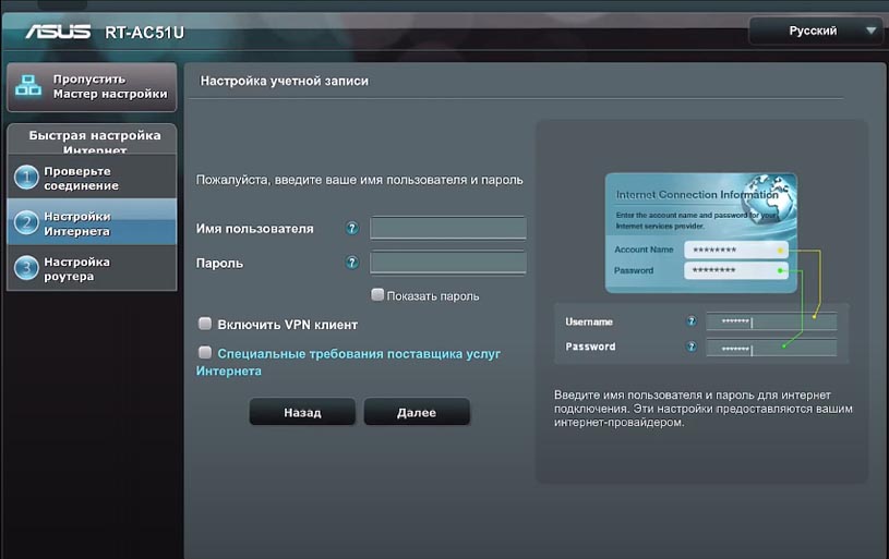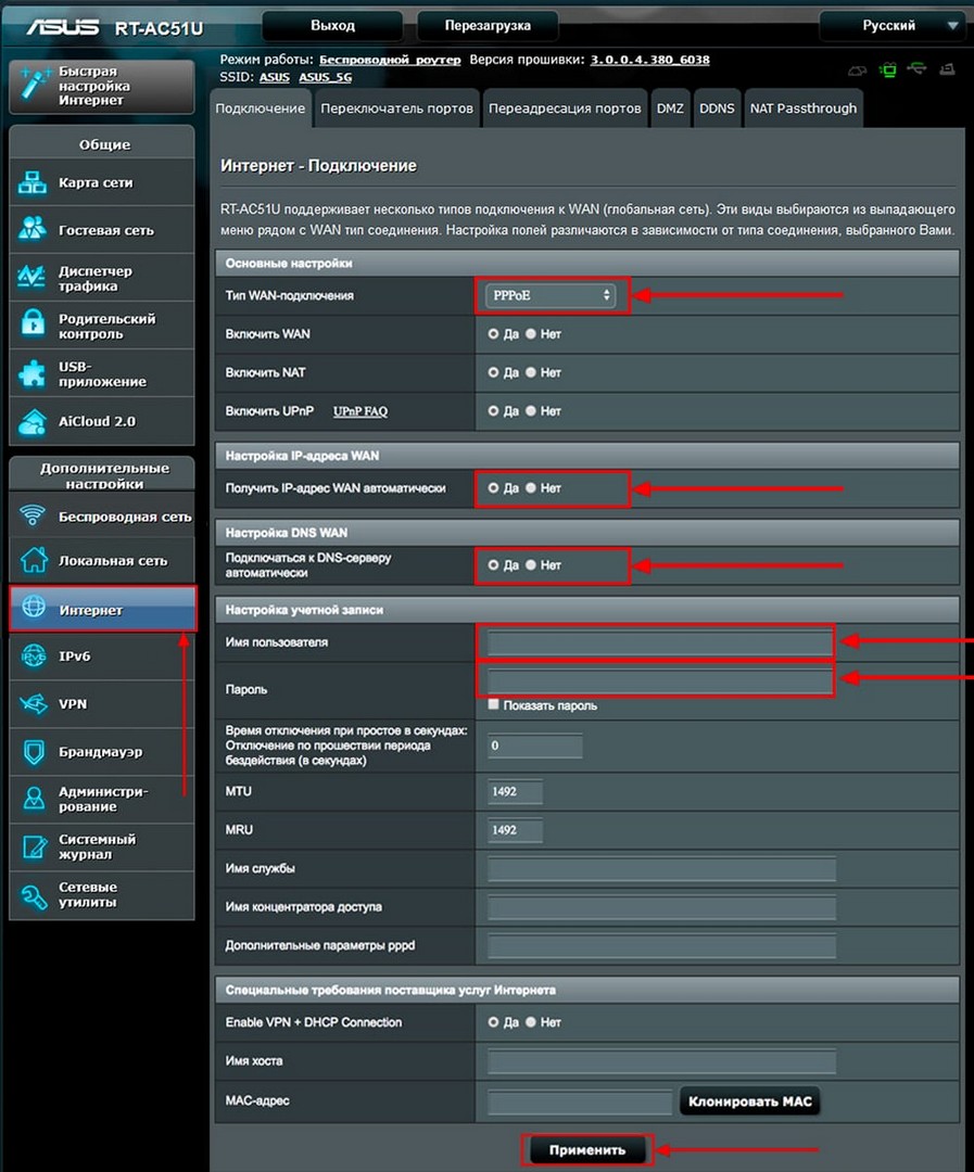 Соответственно, вы выбираете тот тип, который указан в вашей брошюре с инструкцией от поставщика услуг интернета. Поскольку у меня подключение роутера Asus происходит по протоколу PPPoE, то далее необходимо ввести данные для авторизации — логин и пароль.
