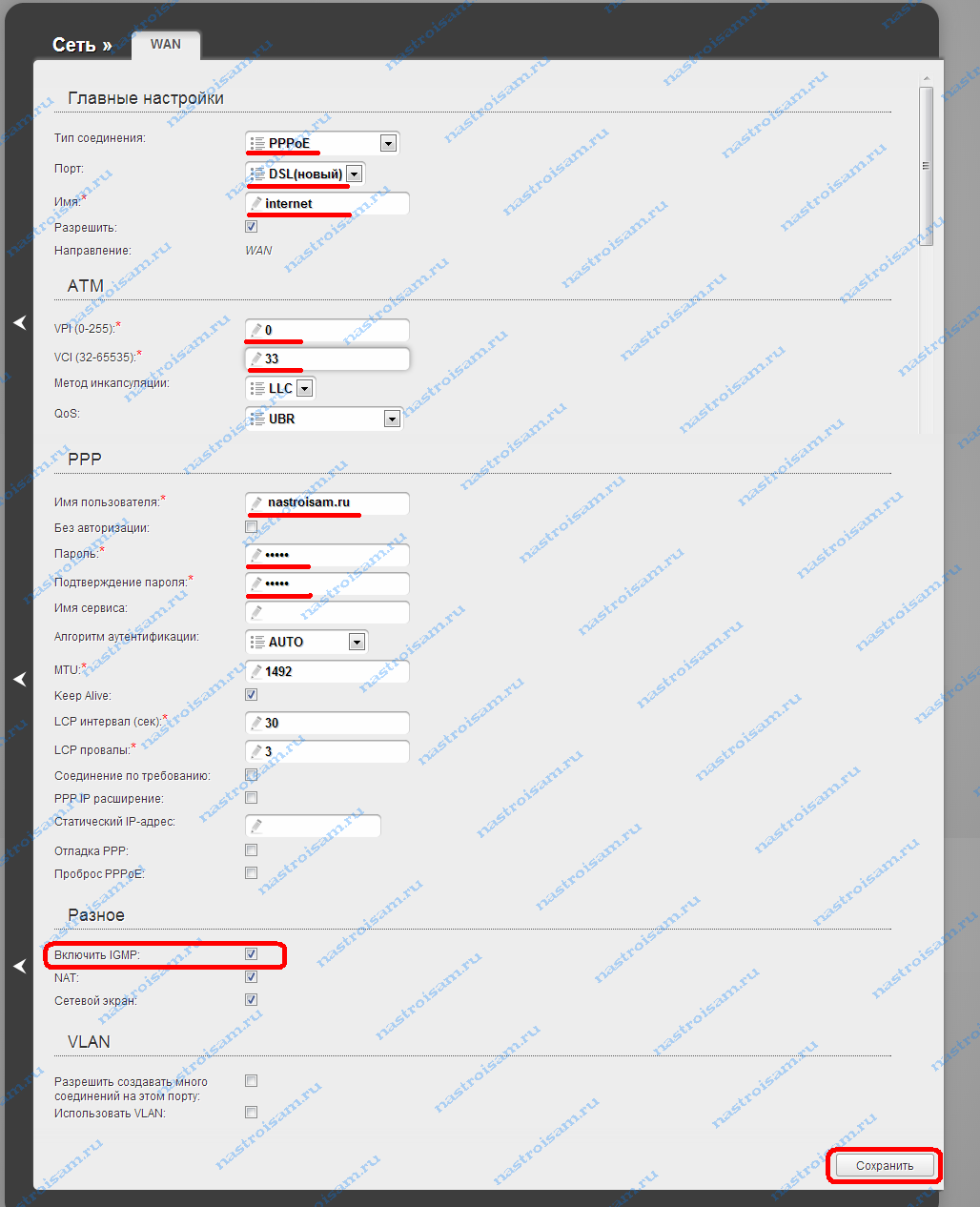 В поле «Имя пользователя» надо прописать логин на подключение к Интернет, а в поля «Пароль» и «Подтверждение пароля» — пароль на доступ, полученный от провайдера.Внимание! Если у Вас подключена услуга Цифровое интерактивное телевидение IPTV, то на этом соединении надо обязательно поставить галку Включить IGMP, иначе на соединении под IPTV мультикаст-трафик бегать не будет.