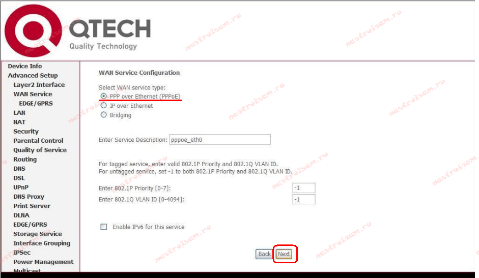 Приведите настройки в соответствии с рисунком ниже. Внимание!!! В графе Enter 802.1Q VLAN ID необходимо указать VLAN «для IP-TV»! Установите приоритет равный 6 и нажмите кнопку Next.