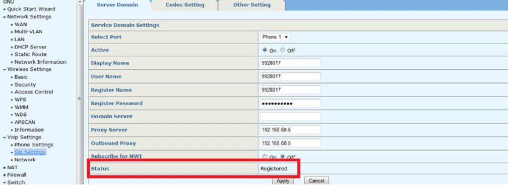 После всех настроек перезагружаем CPE. При включении питания индикатор «SYS» загорится красным цветом, затем через 15 секунд оранжевым (при этом индикатор «WAN» должен загореться зеленым — поднялся линк с коммутатором доступа), и, когда установится PPPoE-сессия, начнет мигать красным/оранжевым. Должен заработать Интернет. В последнюю очередь загорятся индикаторы «POTS» зеленым цветом. Это значит, что CPE «увидела» шлюз для SIP, но при этом регистрации может и не быть. Наличие регистрации необходимо проверить либо просто позвонив с телефона, родключенного к соответствующему порту POTS (при этом телефонный аппарат должен быть переведен в тональный режим), либо в интерфейсе CPE в разделе «VoIP Settings» -> «Sip Settings» -> «Server Domain» в строке «Status» Phone1 и/или Phone2 будет «Registered».