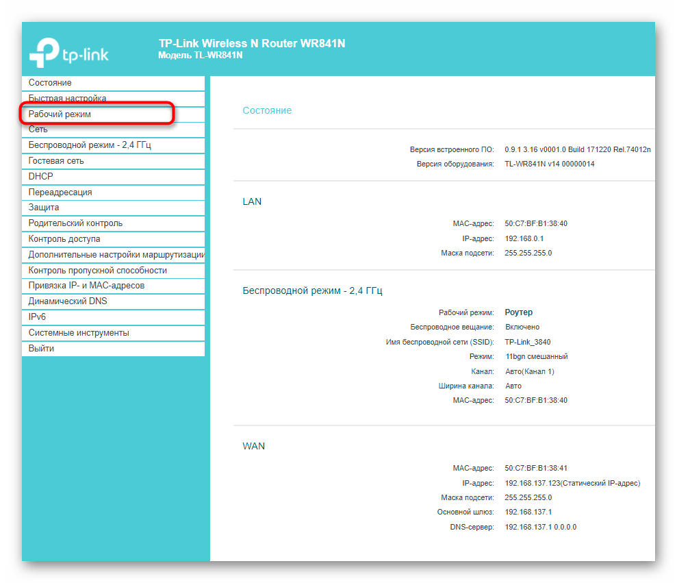 После успешного входа в настройки маршрутизатора выберите раздел «Рабочий режим».