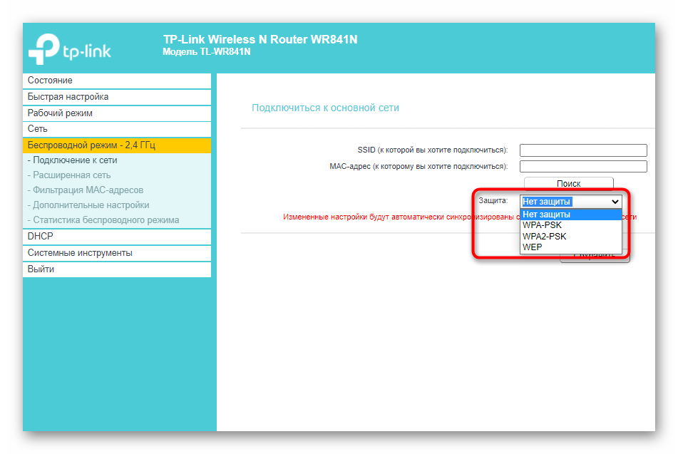 Разверните выпадающее меню «Защита» и выберите протокол, используемый существующей беспроводной сетью.