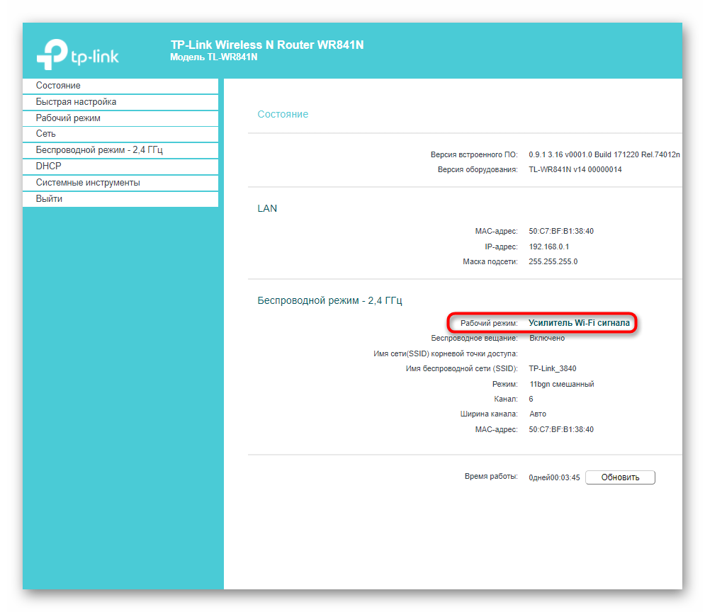 В примечании выше мы уже уточнили о добавлении новых режимов работы в последние версии прошивок маршрутизаторов от TP-Link. Это значительно упростило общий принцип выполнения поставленной задачи, ведь в большинстве случаев пользователю нужно только перевести устройство в соответствующий режим и выбрать существующую сеть для подключения. Дополнительные настройки, о которых мы расскажем в завершающем разделе материала, настраиваются по желанию или во время использования нестандартных сетевых параметров.