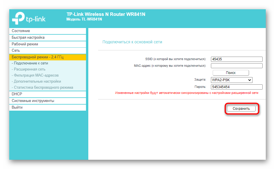 Теперь осталось лишь только настроить параметры безопасности wifi сети. Переходим в меню: Беспроводной режим — Защита беспроводного режима. Выбираем тип шифрования и пароль, который используется на роутере, к которому подключается наш репитер TP-Link. В нашем случае использовалось шифрование WPA2-PSK.