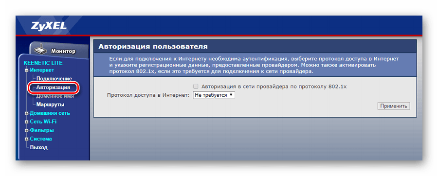 В левой колонке выбираем раздел <class=»strong»>«Интернет» и нажимаем на ссылку «Авторизация».