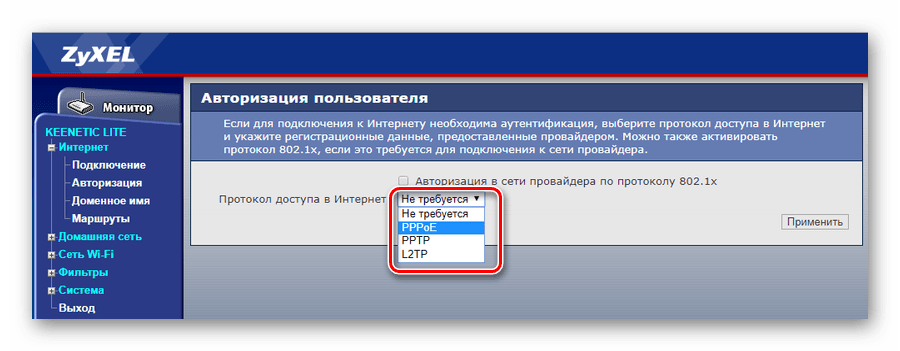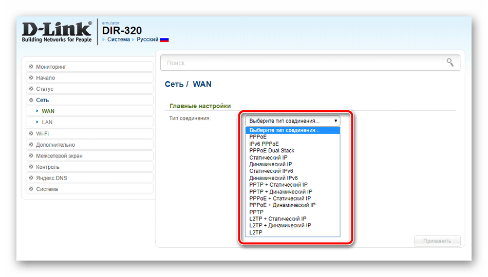 Выбираем в правой части нужный тип подключения. Чаще всего это PPPoE.