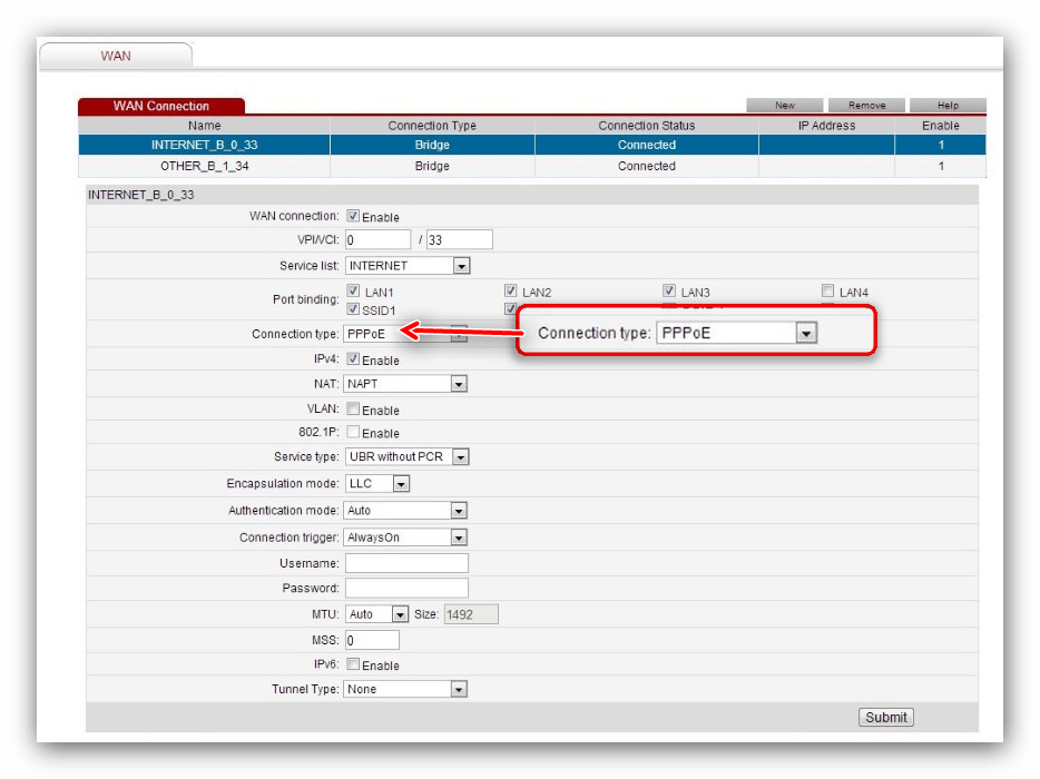 Теперь выберите ваш тип подключения к интернету в раскрывающемся списке «Connection type». Обычно это «PPPoE».