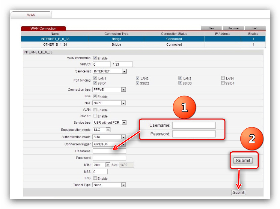 Теперь нужно ввести данные авторизации. Это логин и пароль. Значения их находятся в экземпляре договора с Ростелеком. После внесения данных, нажмите на «Submit».