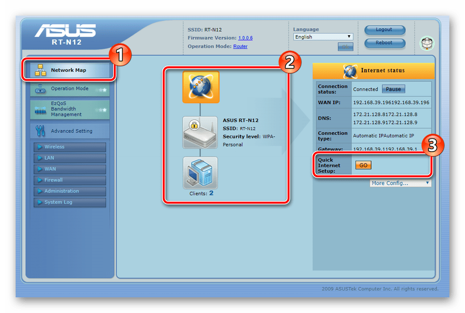 Настройка роутера Asus RT N12 осуществляется легко. Для этого перейдите в категорию «Network Map» и укажите нужный тип подключения.