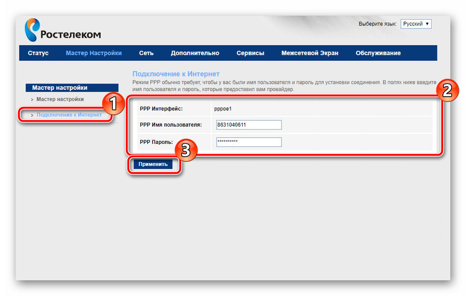 Имя пользователя и пароль — указываем из договора, заключенного с Дом.Ру, ТТК, Seven Sky или другой компанией.