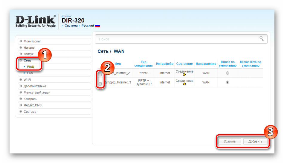 Настройки интернета находятся в меню «Сеть – WAN». Здесь нужно удалить старые соединения и добавить новое.