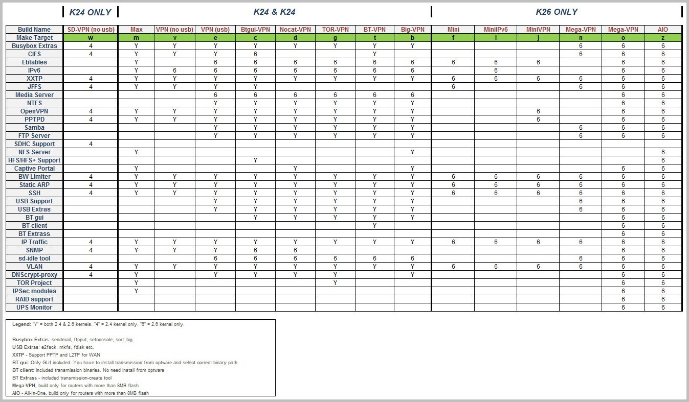 - MIPSR2 — поддержка процессоров используемых в маршрутизаторах Asus RT-N16, NetGear WNR3500Lv1 и т.д.