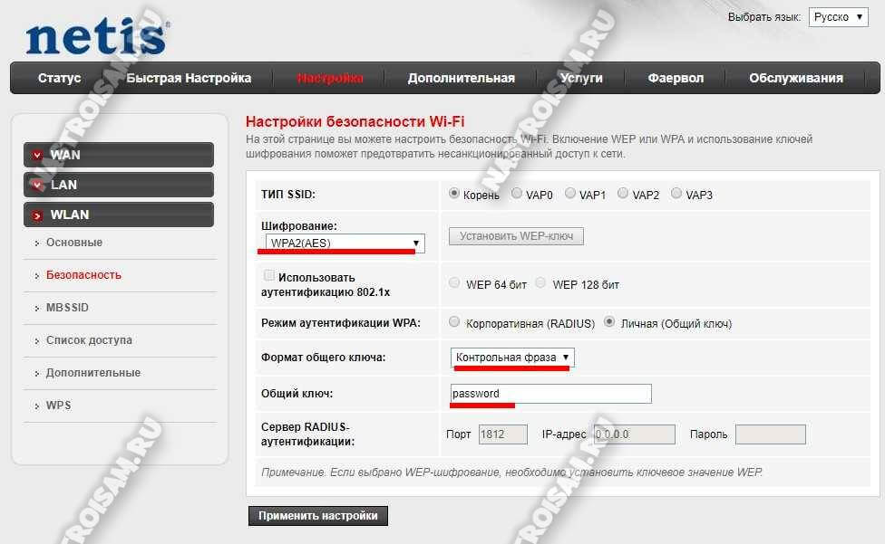 Здесь необходимо выбрать тип шифрования WPA2(AES). Формат общего ключа — «Контрольная фраза». Ниже, в поле «Общий ключ» введите пароль на Вай-Фай, который роутер будет запрашивать при первом подключении клиента. Его необходимо делать посложнее и не короче 8-10 символов.