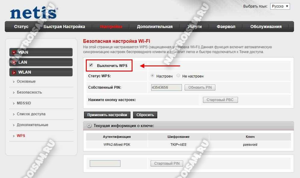 Здесь нужно поставить галку «Выключить WPS» и применить настройки. WPS мы отключаем для того, чтобы малолетние хулиганы, живущие по соседству, не смогли взломать Вашу беспроводную сеть, используя бреши в этой технологии.