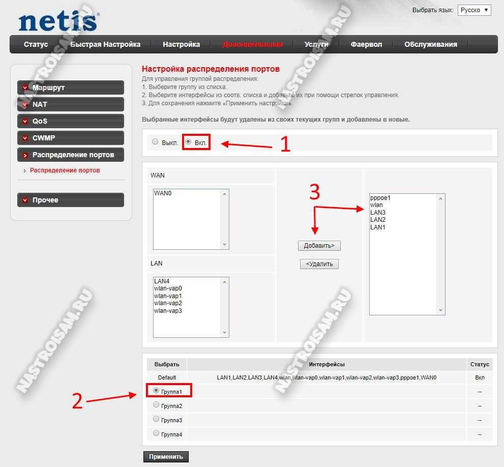 Внизу, в списке групп выбираем первую группу. Она будет отвечать за доступ в Интернет. Теперь выше, надо с помощью кнопки «Добавить» перенести все LAN-интерфейсы, кроме того, в который будет подключаться ТВ-приставка, беспроводную сеть WLAN и Интернет подключение PPPoE в поле справа так, как это сделано на скриншоте. Кликаем на кнопку «Применить».