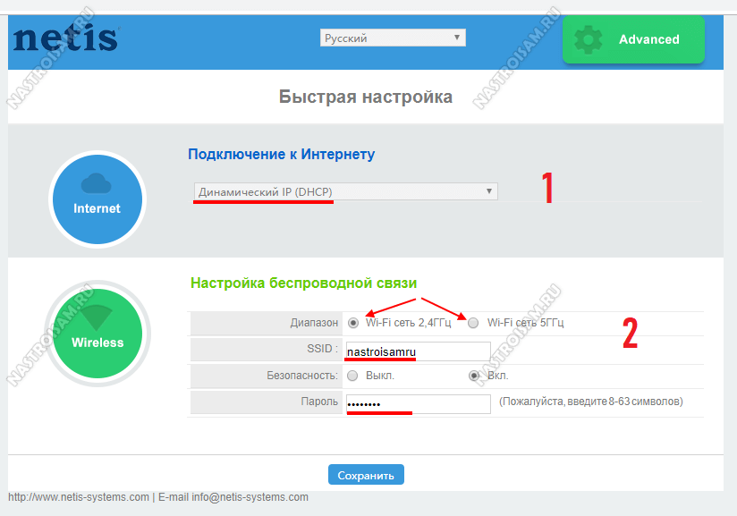 Базовая настройка netis N1 через встроенный мастер выполняется максимально просто. Она разделена на 2 части. Первая отвечает за подключение к Интернету, вторая — за работу беспроводной сети. По умолчанию, тип подключения выставлен как Динамический IP (DHCP), который используется в Билайн и ТТК-урал. Если же Ваш провайдер использует протокол PPPoE — выберите его в списке.