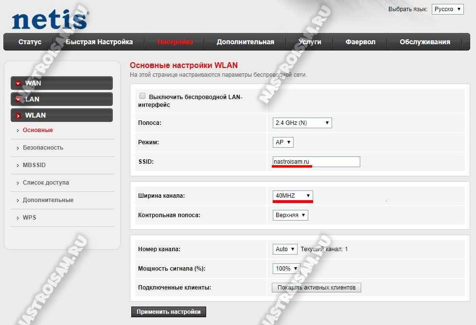 Тут надо придумать имя своей беспроводной сети и прописать его в поле «SSID». Так же, в большинстве случаев, для увеличения скорости WiFi я обычно советую выставить ширину канала в 40 MHz.