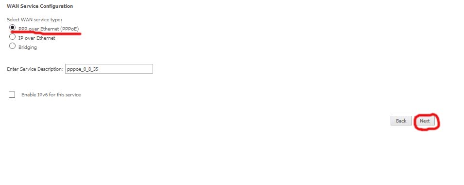 Чтобы подключить роутер QTech QDSL-1040WU по этому протоколу необходимо выбрать «PPP over Ethernet (PPPoE)» в «Select WAN service type» и щёлкнуть«Дальше».