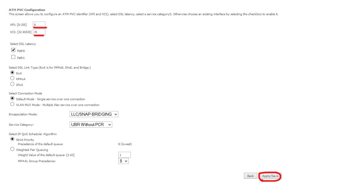 После того как прописали VPI VCI, остальные значения не трогаем оставляем как есть и жмем apply/save