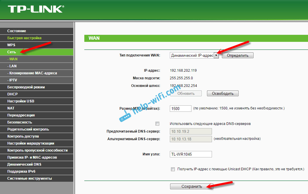 Открываем «Сеть» — во вкладке WAN ставим Dynamic IP, если у вас протокол — автоматический IP. Сразу сохраняемся — никаких дополнительных настроек не нужно.