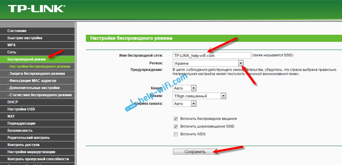 Для этого вам нужно зайти в меню “Беспроводное подключение” (все на той же страничке по адресу tplinklogin.net либо 192.168.0.1). Здесь вы можете установить наименование вашего подключения. Это нужно, чтобы вы легко могли определить свой канал и при необходимости подключиться к нему. В названии нельзя использовать кириллицу, только латинские буквы и цифры любого регистра.