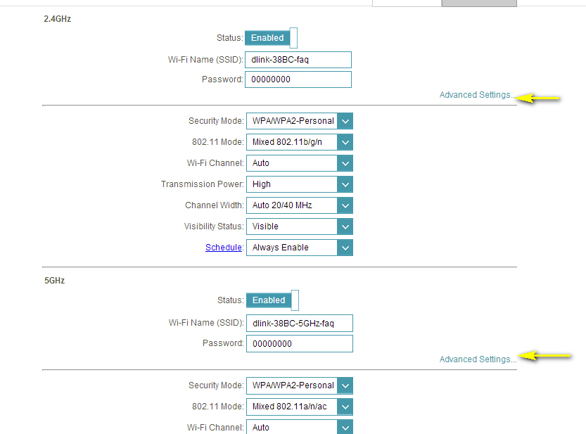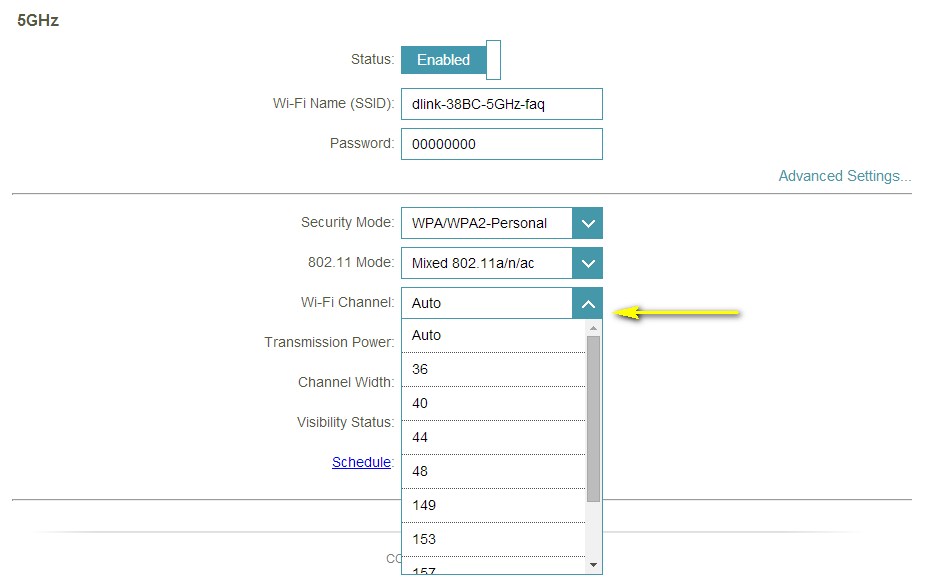 Шаг 4: Нажмите « Дополнительные настройки» для диапазона, для которого вы хотите изменить беспроводной канал. Выберите канал в раскрывающемся меню « Wi-Fi Channel» . Процесс выбора режима одинаковый для полос 2,4 ГГц и 5 ГГц, однако параметры, доступные для каждого диапазона, различны.