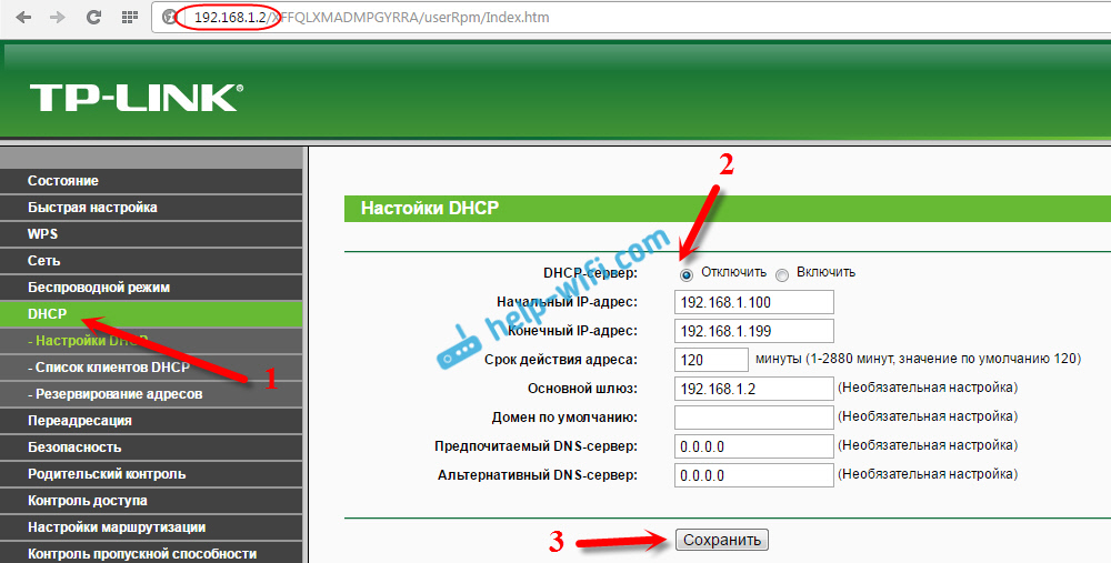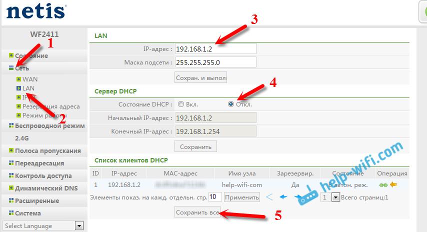 Откройте вкладку «Сеть» – «LAN». Меняем IP-адрес. Если у главного роутера, или модема 192.168.1.1, то пишем 192.168.1.2. Что бы отличалась только последняя цифра. Там же отключаем DHCP-сервер. И сохраняем настройки.