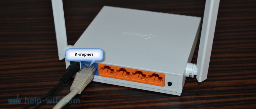 Для начала подключите к TL-WR844N адаптер питания и включите его в розетку. Дальше, в WAN-порт (он синего цвета) подключите сетевой кабель от интернет-провайдера, или от модема.