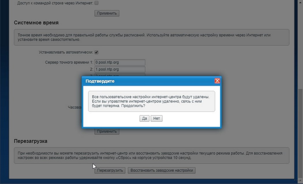 При этом система обязательно выдаст предупреждение о том, что параметры интернет-центра будут удалены и связь с ним будет потеряна: