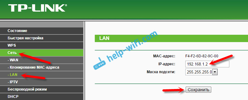 Для начала, заходим в настройки маршрутизатора TP-LINK, который хотим настроить в режиме беспроводной точки доступа. И меняем IP-адрес роутера. Для этого, откройте вкладку «Network» – «LAN». Нам нужно задать IP адрес, такой же как у основного роутера (можно посмотреть на самом устройстве), только с другой цифрой в конце. Например: если IP-адрес главного модема (роутера) 192.168.1.1, то в настройках TP-LINK нужно задать 192.168.1.2, и сохранить настройки. Роутер будет перезагружен.