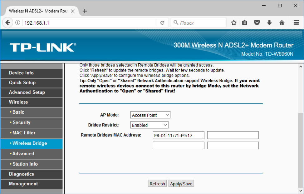 Wireless Bridge (WDS): возможность использовать Вай-Фай роутер как «репитер» – повторитель уже имеющегося сигнала Wi-Fi. Применяется для «удлинения» радиуса действия другого работающего и настроенного роутера. В других случаях нужно использовать уже настроенный режим AP (Access Point – режим точки доступа).