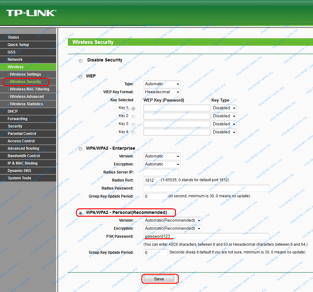 В поле «Pre-Shared Key» придумываем и прописываем пароль на Вай-Фай, который будет запрашиваться при подключении клиентов. Его лучше делать не короче 8 знаков, используя цифры и буквы латинского алфавита.