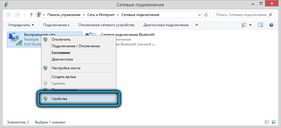 В новом окне сетевых подключений кликаем ПКМ по текущему подключению и выбираем пункт «Свойства».