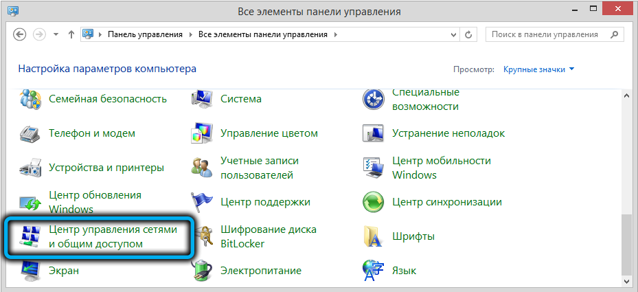 Для проверки через меню «Пуск» запускаем «Панель управления», где выбираем вкладку «Центр управления сетями…».