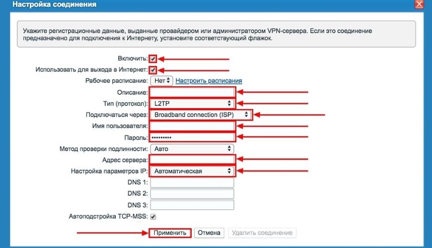 - В Описание» прописываем слово на английской раскладке клавиатуры, например «RED», Тип (протокол)» выбираем L2TP», Подключаться через» выбираем Broadband connection (ISP)».