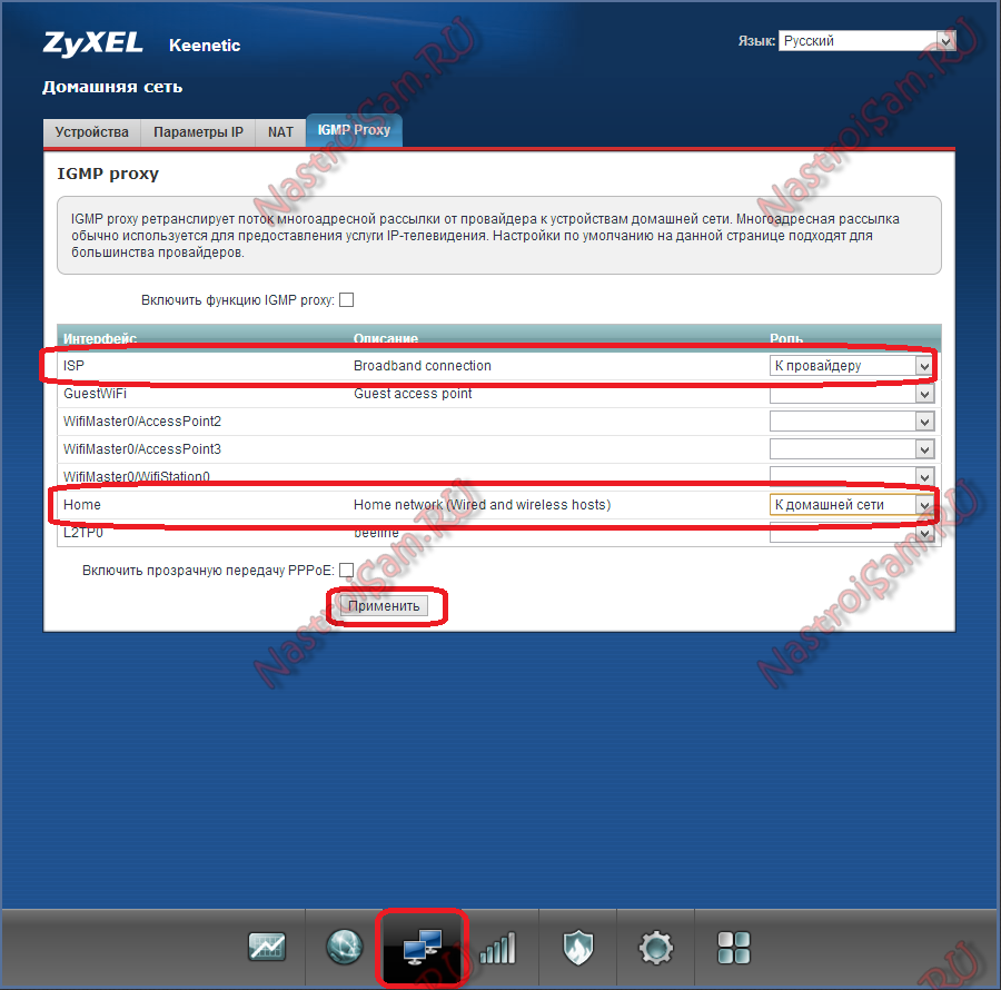 На порт STB-приставки такую галочку ставить не надо, т.к. роутер должен тег снимать и дальше трафик отправлять нетегированным — приставка снимать теги не умеет. Нажимаем кнопку Применить. Все, настройка IPTV на Zyxel Keenetic NDMS 2.00 закончена — можно подключать ТВ-приставку в 4-й порт.